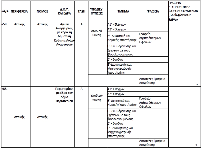 ζ) Στον Πίνακα της περίπτωσης α’ της υποπαραγράφου 4 της παραγράφου Α’ της αριθ. Δ.ΟΡΓ. Α 1001512 ΕΞ 2017/05-01-2017 (Β’ 12, 52, 234 & 1032) απόφασής μας, όπως ισχύει, διαγράφουμε τη γραμμή, που αφορά στη Δ.Ο.Υ. «Β’ ΠΕΡΙΣΤΕΡΙΟΥ» του νομαρχιακού προϋπολογισμού Αθηνών και αντικαθιστούμε στη γραμμή, που αφορά στην υφιστάμενη Δ.Ο.Υ. «Α’ ΠΕΡΙΣΤΕΡΙΟΥ», στη στήλη 3 «ΓΙΑ ΤΗ Δ.Ο.Υ.:», τον τίτλο από «Α’ ΠΕΡΙΣΤΕΡΙΟΥ» σε «ΠΕΡΙΣΤΕΡΙΟΥ», και στη στήλη 4 «ΤΑΞΗ», τον χαρακτηρισμό από «Α-Β» σε «Α».