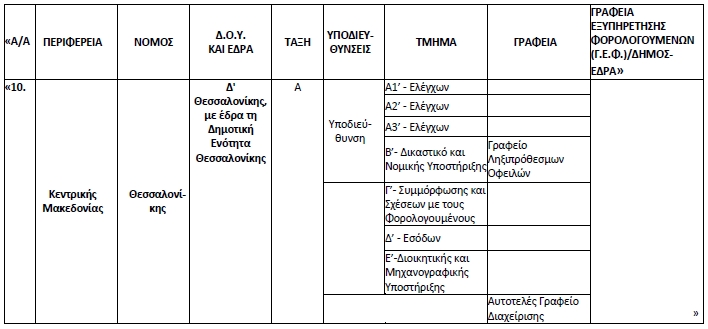 β) Συνιστούμε στη Δ.Ο.Υ. Δ’ Θεσσαλονίκης (Α’) ένα (1) επιπλέον Τμήμα, με τίτλο «Α’3 Ελέγχων». γ) Παύει να λειτουργεί η Δ.Ο.Υ. ΣΤ’ Θεσσαλονίκης, Α’-Β’ τάξεως και η αρμοδιότητα παρακολούθησης και διεκπεραίωσης όλων των εκκρεμών υποθέσεων αυτής περιέρχεται στη Δ.Ο.Υ. Δ’ Θεσσαλονίκης, Α’ τάξεως, η οποία υπεισέρχεται αυτοδικαίως και χωρίς καμία άλλη διατύπωση στα δικαιώματα, στις απαιτήσεις, στις υποχρεώσεις και στις εκκρεμείς δικαστικές υποθέσεις αυτής.