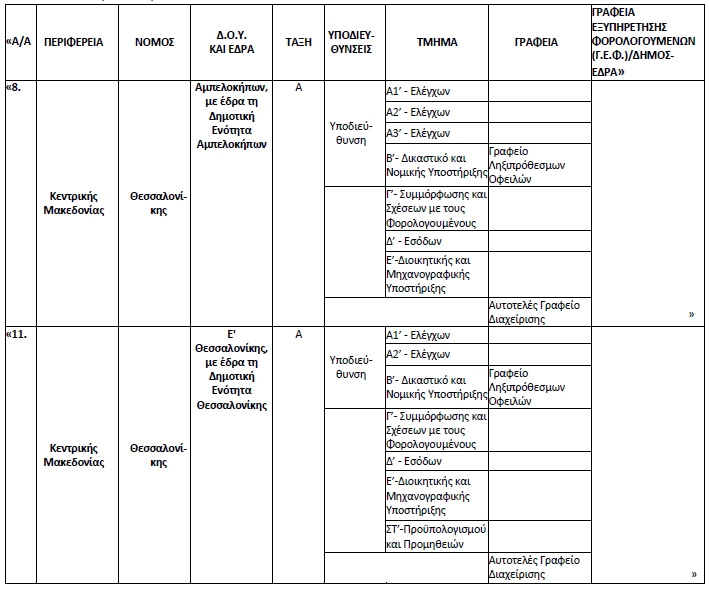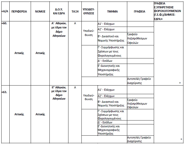 3. – Από τις ημερομηνίες συγχώνευσης των Δ.Ο.Υ., που ορίζονται στην υποπαράγραφο 1 της παρούσας παραγράφου στους νομούς Θεσσαλονίκης και Αττικής, επέρχονται στον Πίνακα της παραγράφου 8 του άρθρου 39 «Δημόσιες Οικονομικές Υπηρεσίες (Δ.Ο.Υ.)» οι κατωτέρω αλλαγές, σύμφωνα με τα οριζόμενα στις περιπτώσεις I, II, III, IV και V της ως άνω υποπαραγράφου, ως εξής: