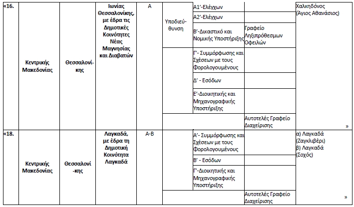 ββ) της Δημοτικής Ενότητας Μυγδονίας και της Δημοτικής Ενότητας Ωραιοκάστρου του Δήμου Ωραιοκάστρου μεταφέρονται στη Δ.Ο.Υ. Αμπελοκήπων, Α’ τάξεως και θα ασκούνται από τα Τμήματα «Ελέγχων» και από το Τμήμα «Δικαστικό και Νομικής Υποστήριξης» αντίστοιχα, αυτής.