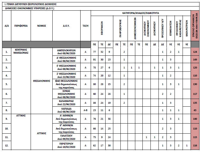 Β.- 1) Καθορίζουμε τις οργανικές θέσεις προσωπικού στις παρακάτω Δημόσιες Οικονομικές Υπηρεσίες (Δ.Ο.Υ.), που λειτουργούν στους νομούς Αττικής και Θεσσαλονίκης, μόνιμου και με σχέση εργασίας ιδιωτικού δικαίου, κατά κατηγορία, κλάδο και ειδικότητα, οι οποίες καθορίζονται και ισχύουν από την ημερομηνία που αναγράφεται κάτω από κάθε Δ.Ο.Υ., ως εξής:
