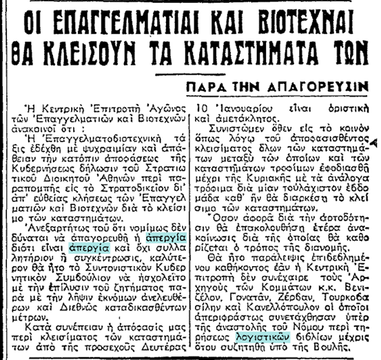 Απαγορεύομεν το κλείσιμον των καταστημάτων των Επαγγελματιών και Βιοτεχνών εν γένει κατά τας εργάσιμους ώρας και ημέρας και πάσαν συγκέντρωσιν αυτών άνευ ημετέρας αδείας.