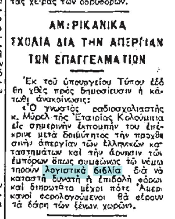 Ο γνωστός σχολιαστής κ Μύρελ της Εταιρίας Κολούμπια εις σημερινήν εκπομπήν του έκρινε μετά δοιμύτητος την προχθεσινήν απεργίαν των ελληνικών καταστημάτων και την άρνησιν των εμπόρων όπως συμφώνως τω νόμω τηρούν λογιστικά βιβλία δια να καταστή δυατή η επιβολή φόρων και διηρώταται μέχρι πότε Αμερικάνοι φορολογουμένοι θα φέρουν τα βάρη των ξένων χωρών …