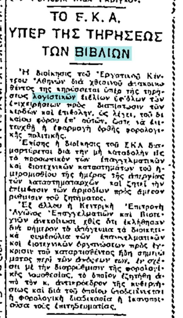 Η διοίκησις του εργατικού Κέντρο Αθηνών δια χθεσινού ανακοινωνθέντος της κηρύσσεται υπέρ της τηρήσεως λογιστικών βιβλίων υπ’ όλων των επιχειρήσεων προς διαπίστωσιν των κερδών και επιβολής, ως λέγει, του δίκαιου φόρου επ’ αυτών ώστε να επιτευχθή η εφαρμογή ορθής φορολογικής πολιτικής.