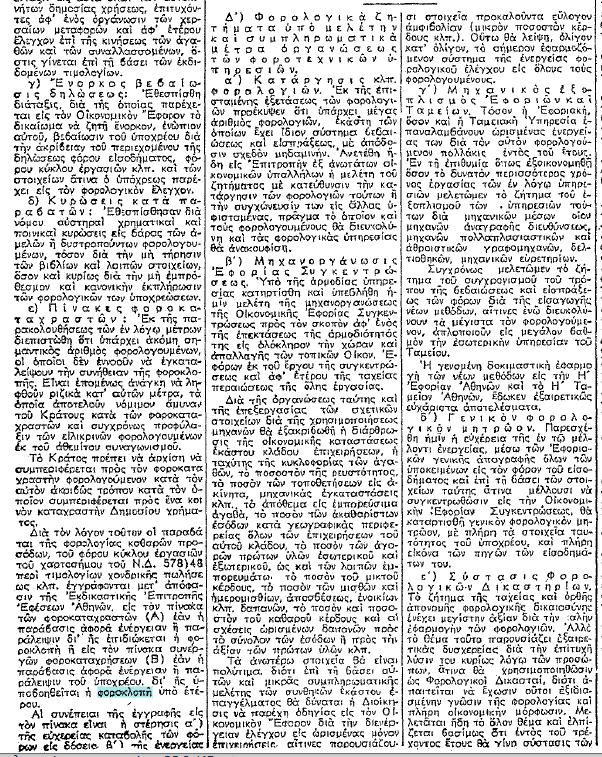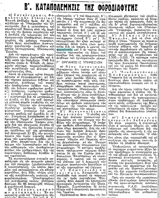 «Διά της εισόδου της Ελλάδος εις τον πόλεμον από τις 28 Οκτωβρίου 1940, της κατοχής ταύτης υπό των εχθρών, και του επακολουθήσαντος εξευτελισμού του εθνικού νομίσματος, εδημιουργήθησαν εν τη χώρα τοιαύται οικονομικαί συνθήκαι, ώστε κατέστη αδύνατος η εφαρμογή της κειμένης φορολογικής νομοθεσίας. Κατά την περίοδον ταύτην ωρισμένα πρόσωπα, γενόμενα, ως επί το πλείστον, επιλήσμονα των προς την Κοινωνίαν και την φυλήν μας υποχρεώσεων των, επλούτησαν. Τα πλούτη ταύτα, κτηθέντα κυρίως διά της συνεργασίας μετά των Αρχών Κατοχής ή και άνευ ταύτης, διά της εκμεταλλεύσεως της δυστυχίας του Ελληνικού Λαού, ουδένα φόρον επλήρωσαν. …