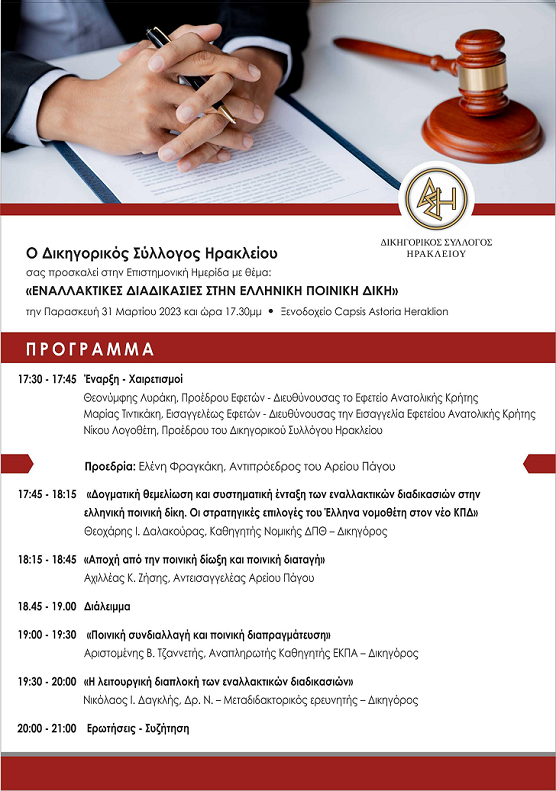 24 Μαρτίου, 2023 Πρόσκληση σε Επιστημονική Ημερίδα του ΔΣΗ “ΕΝΑΛΛΑΚΤΙΚΕΣ ΔΙΑΔΙΚΑΣΙΕΣ ΣΤΗΝ ΕΛΛΗΝΙΚΗ ΠΟΙΝΙΚΗ ΔΙΚΗ” – Δικηγορικός Σύλλογος Ηρακλείου .clearfix { display: inline-block; } /* IE7xhtml*/ Λεπτομέρειες Δημιουργήθηκε στις 24 Μάρτιος 2023 Share