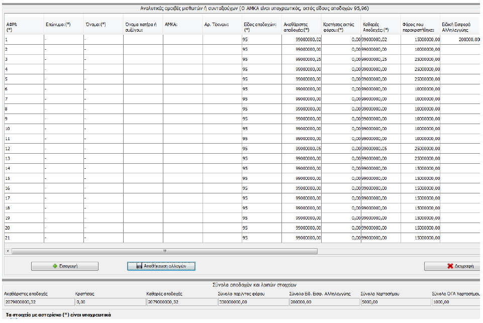 Στην περίπτωση που ο χρήστης θέλει να εισάγει ποσό μεγαλύτερο των 99.999.99,99 τότε θα πρέπει το ποσό αυτό να το σπάσει σε μικρότερα ποσά μικρότερα των 99.999.99,99 και να γίνουν περισσότερες εγγραφές με τον κωδικό 94, 95 ή 96 κατά περίπτωση. Στις περιπτώσεις αυτές, όταν δηλαδή ο χρήστης θέλει να εισάγει πολλές εγγραφές για υπόχρεους χωρίς ΑΦΜ με τον ίδιο κωδικό αποδοχών, δεν θα πρέπει να αφήνει εντελώς κενά τα ΑΦΜ, αλλά θα πρέπει να εισάγει κάτι διαφορετικό σε κάθε εγγραφή στο πεδίο ΑΦΜ (οτιδήποτε, π.χ. 1, 2, 3). Σε αντίθετη περίπτωση θα τους εμφανίζεται το μήνυμα «Υπάρχουν πολλαπλές εγγραφές με τον ίδιο ΑΦΜ και είδος αποδοχών»).