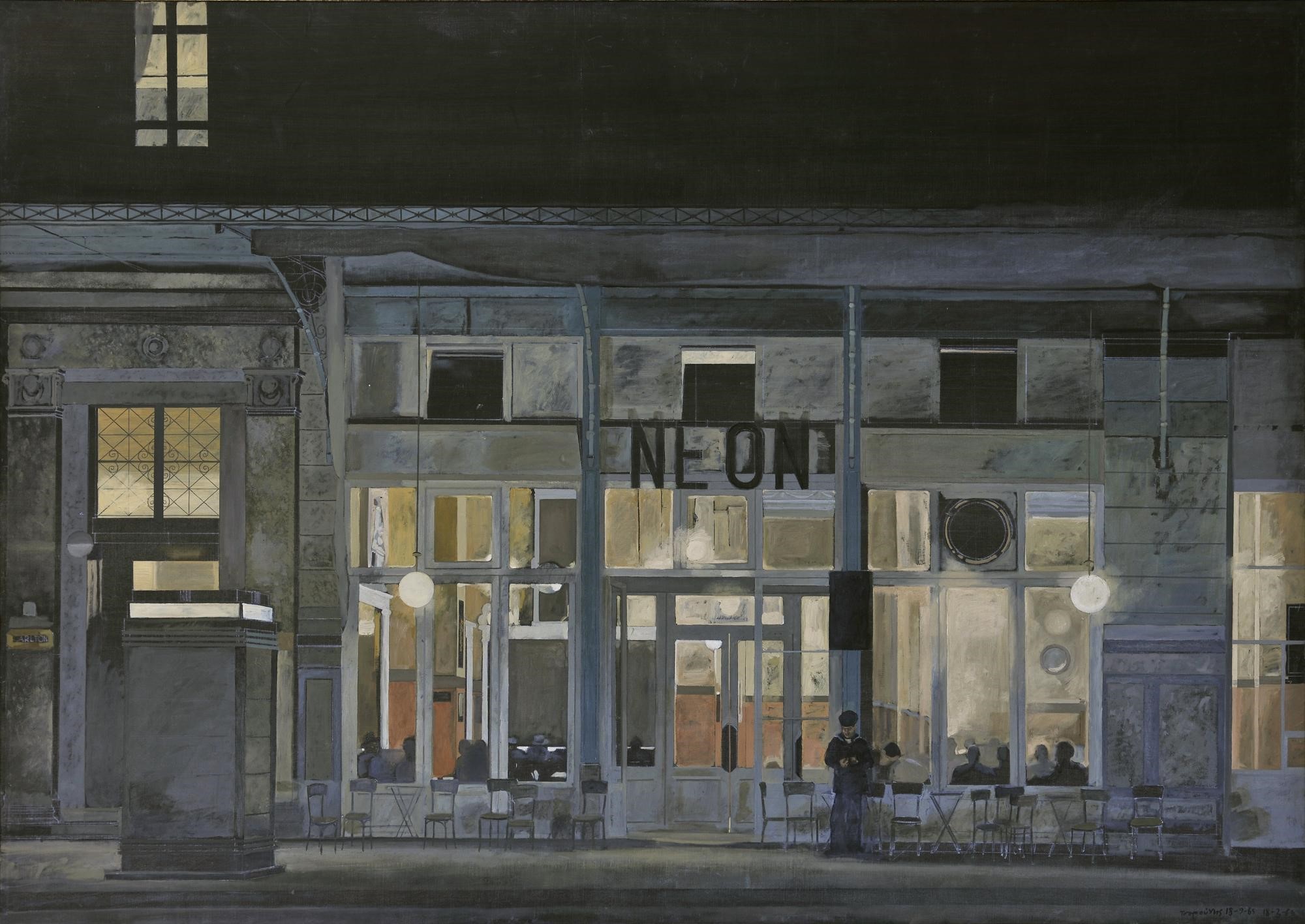 ( Τσαρούχης Γιάννης (1910 – 1989) Καφενείον το Νέον (Νύχτα), 1965 – 1966 Λάδι σε μουσαμά, 127 x 180 εκ. αρ. έργου: Π.3498 Εκτίθεται Εθνική Πινακοθήκη )