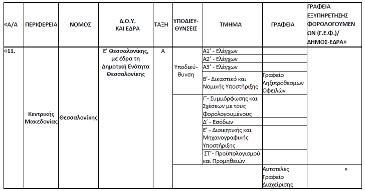 «3. δ) Οι υπηρεσίες των Δημόσιων Οικονομικών Υπηρεσιών (Δ.Ο.Υ.) που προβλέπονται στη στήλη 6 του πίνακα της περίπτωσης α΄ της υποπαραγράφου 4 της παρ. Α΄ της αριθμ. Δ. ΟΡΓ. Α 1001512 ΕΞ 2017/5-1-2017