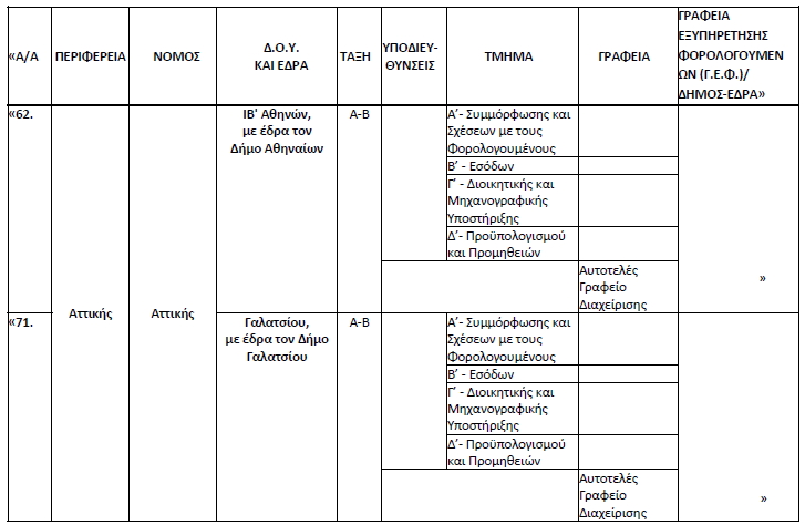 ββ) της Δ.Ο.Υ. Παλλήνης (Α΄) για τον Φορέα 90-08, (στοιχείο 7 του πίνακα) του Ειδικού Φορέα Υπηρεσιών Φορολογικής Διοίκησης, 231, μεταβιβάζονται στον Προϊστάμενο της Δ.Ο.Υ. Γαλατσίου (Α΄-Β΄) για τον Φορέα 90-08/231 και ειδικότερα για τις Δ.Ο.Υ. Αχαρνών (Α΄-Β΄), Κορωπίου (Α΄-Β΄) και Παλλήνης (Α΄),