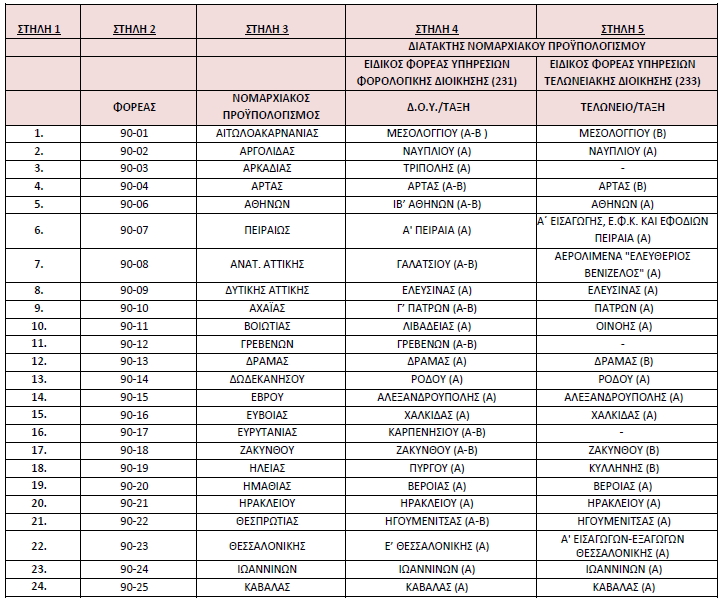 «2. α) Μεταβιβάζουμε την αρμοδιότητα του διατάκτη νομαρχιακού προϋπολογισμού της Ανεξάρτητης Αρχής Δημοσίων Εσόδων (Α.Α.Δ.Ε.), ανά νομαρχιακό προϋπολογισμό, σύμφωνα με τις διατάξεις του ν. 4270/2014 (ΦΕΚ Α΄ 143), στους Προϊσταμένους των κατωτέρω Δημόσιων Οικονομικών Υπηρεσιών (Δ.Ο.Υ.), για τον ειδικό φορέα Υπηρεσιών Φορολογικής Διοίκησης, 231 και στους Προϊστάμενους των κατωτέρω Τελωνείων, για τον ειδικό φορέα Υπηρεσιών Τελωνειακής Διοίκησης, 233, που αναφέρονται στις στήλες 4 και 5 του κάτωθι πίνακα, αντίστοιχα, πλην των περιπτώσεων που η αρμοδιότητα του διατάκτη μεταβιβάζεται με την παρούσα σε άλλα όργανα, ως εξής: