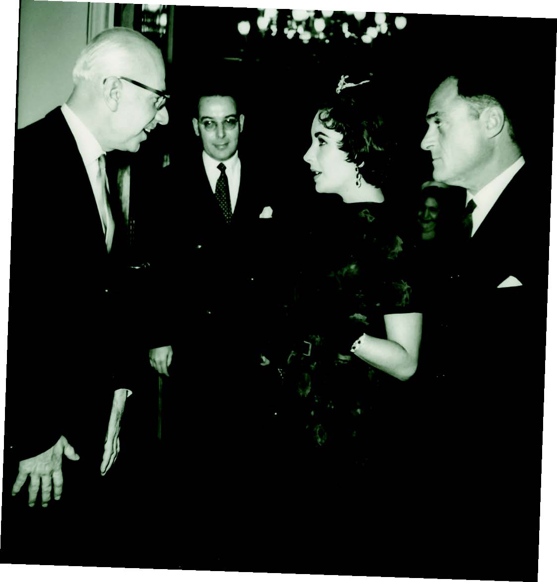 Ο Ξενοφών Ζολώτας σε δεξίωση στο ξενοδοχείο Μεγάλη Βρετανία με την Elizabeth Taylor. Δεξιά στη φωτογραφία ο σύζυγός της Michael Todd, 4.2.1958 (Web, Print) |
