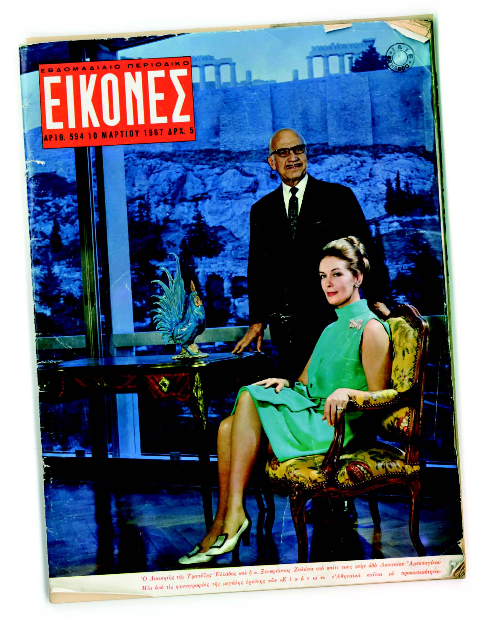 Εξώφυλλο του εβδομαδιαίου περιοδικού Εικόνες με τον Ξενοφώντα Ζολώτα και τη σύζυγό του στην κατοικία τους, 10.3.1967 (Web, Print) |