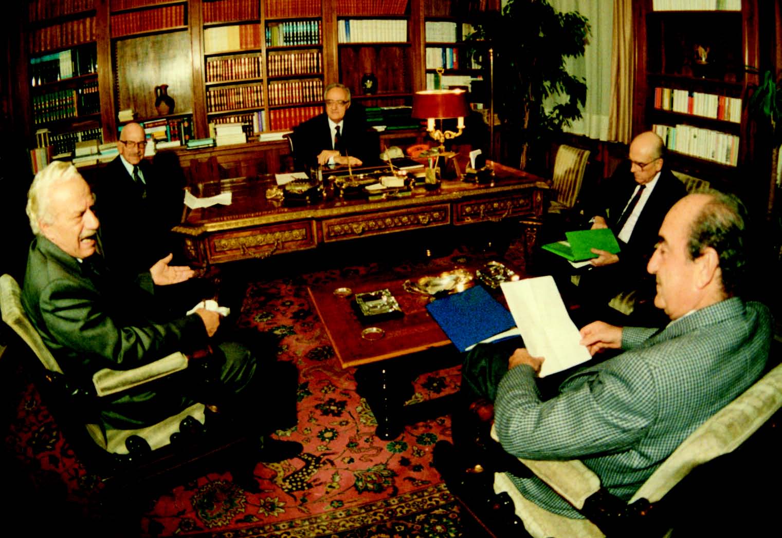 Συνάντηση του Προέδρου της Δημοκρατίας Χρήστου Σαρτζετάκη με τον Πρωθυπουργό Ξενοφώντα Ζολώτα και τους πολιτικούς αρχηγούς στο Προεδρικό Μέγαρο, 21.11.1989 (Web, Print) |