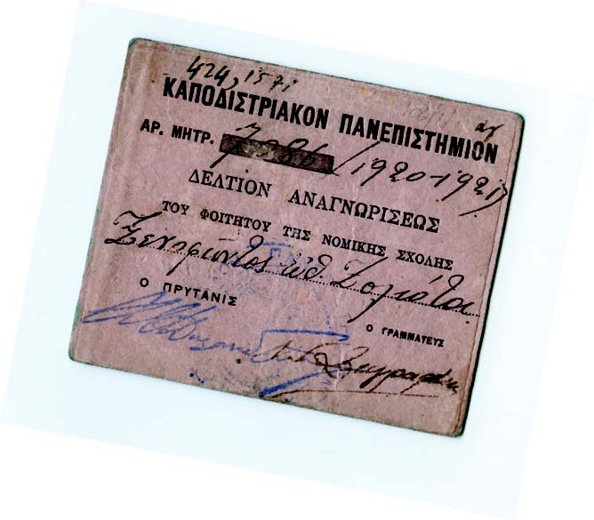 Φοιτητική ταυτότητα του Ξενοφώντος Ζολώτα από το Πανεπιστήμιο Αθηνών, Τμήμα Νομικής, 1920-1921 (Web, Print) |