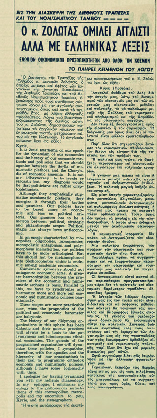 Άρθρο στην εφημερίδα Το Βήμα, όπου δημοσιεύεται ο δεύτερος λόγος στα αγγλικά με λέξεις ελληνικής προέλευσης που εκφώνησε ο Ξενοφών Ζολώτας στο ΔΝΤ, 4.10. 1959 (Web, Print) |