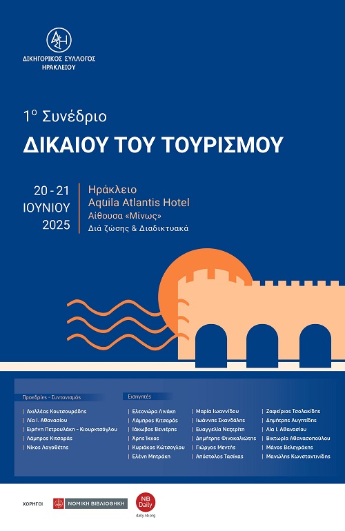 Ο Δικηγορικός Σύλλογος Ηρακλείου διοργανώνει το 1ο Συνέδριο Δικαίου του Τουρισμού, το οποίο θα διεξαχθεί στο Ηράκλειο, στις 20 και 21 Ιουνίου 2025, στο ξενοδοχείο Aquila […]